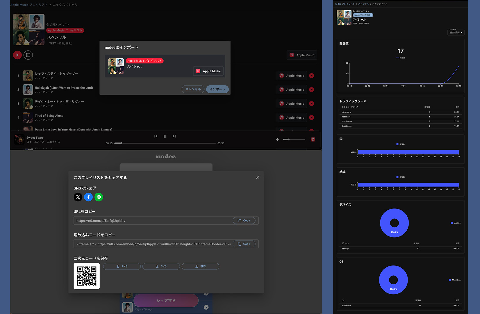 SpotifyやApple Musicと連携し、自分のプレイリストをインポートすることも可能です。nodee上で公開設定に変更すれば、オリジナルのプレイリストページを簡単にシェアできます。