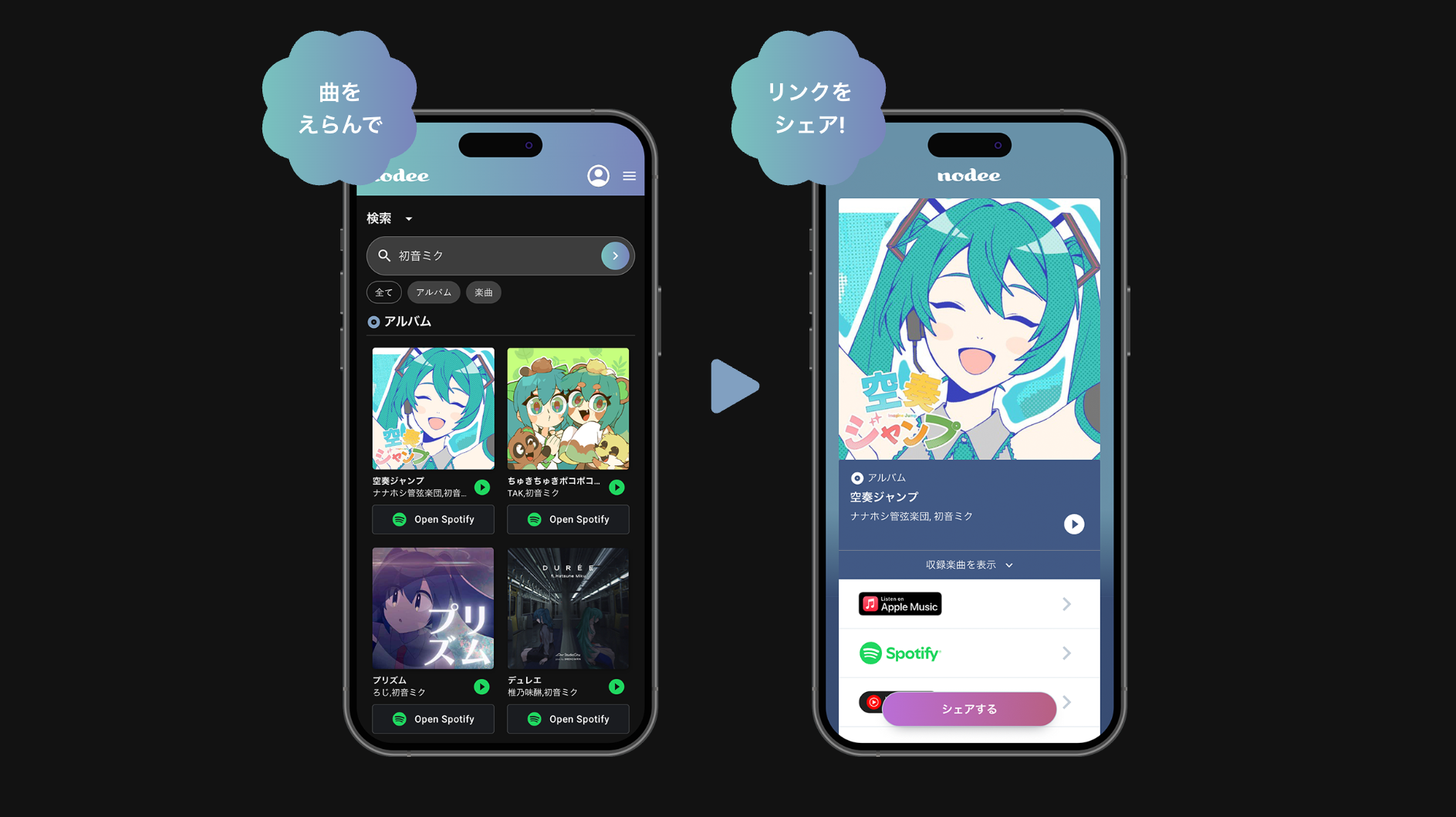 また、nodee内からSpotifyやApple Musicでの試聴も可能。