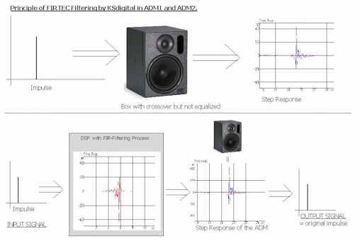 このアナログ・ベッセル・フィルターの特徴はクロスオーバー周波数帯全体に渡ってほぼ一定の遅延が得られる事にあります。FIRTEC TMというこの独自の FIR フィルター実装システムは、5 ミリ秒の「アナ ログ」の遅延を利用することで、あらかじめシステムのパルス応答が数学的に均一化され音楽信号が正しく再生され、音の大きさと位相周波数特性が線形化。これによって、フィルタリングされた信号の傾斜がクロスオーバー・ポイントで維持され、コンセプトである『点音源』としての中立性を支えています。