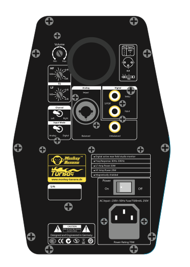 “Turbo”シリーズには、XLR/TRSコンボジャック、RCA入力端子を搭載し、あらゆる機材からの入力に対応可能!さらには、S/PDIFデジタル入力端子も搭載し、オーディオ・インターフェースや、デジタルミキサーからの出力を、信号のロス無しでダイレクトに再生可能。ここまで豊富な入力端子を備えたモデルはなかなかありません。
