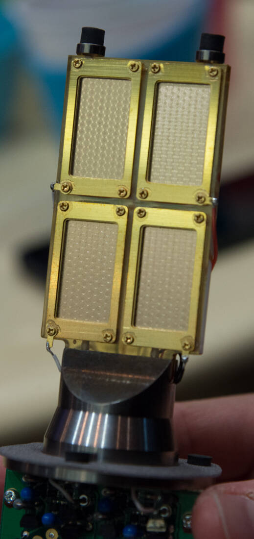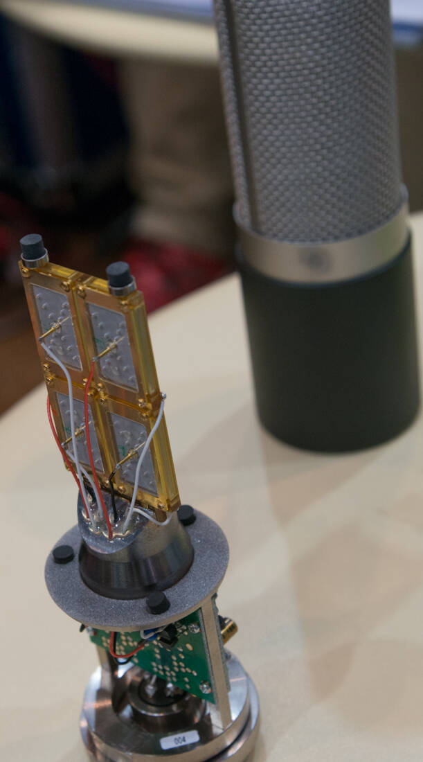 ダイヤフラム4枚というのは指向性に対してもメリットがあるんですよ。原理的に、正面から来る音は4枚のダイヤフラムに同時に到達しますが、横からの音は左右ダイヤフラムの距離の関係で位相差が生まれます。しかしこの距離は17mm程度。20kHzの1波長くらいの距離なので、可聴帯域にはほとんど影響を及ぼしません。