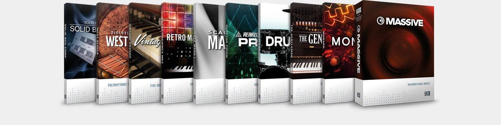 MASCHINE STUDIOにはKOMPLETE SELECTが付属します。KOMPLETE SELECTはすべての音楽スタイルに対応するインストゥルメントとエフェクトをバンドルしたプレミアム・セレクションです。 これまでのMASCHINEにはMASSIVE、REAKTOR PRISM、SCARBEE MARK I、SOLID BUS COMPが付属していました。 今バージョンではさらにMONARK、THE GENTLEMAN、DRUMLAB、RETRO MACHINES、VINTAGE ORGANS、WEST AFRICAが付属します。
