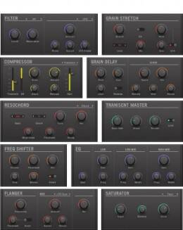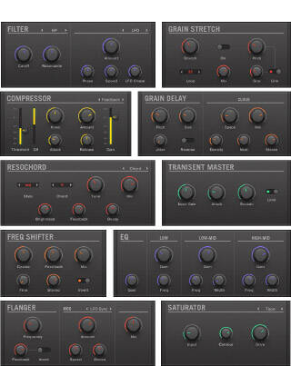 クラシック/フィードバックコンプレッサー、テープ/チューブサチュレーター、トランジエントデザイナー、各リバーブ、各フィルターやEQに加えて、Grain-Delay、Ice Verb、Freq Shifter等のクリエイティブツール。