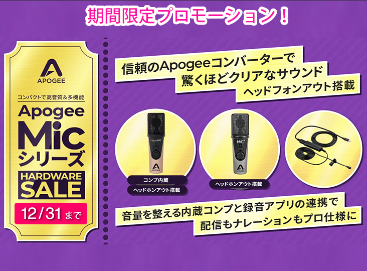 Apogeeのマイク3製品(HypeMiC、MiC Plus、ClipMic Digital2)が特価に!さらに、2つのレコーデ…