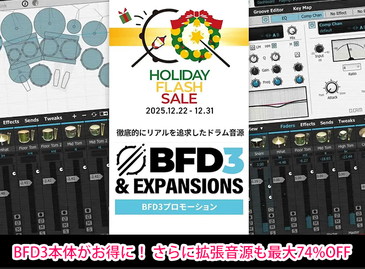 年末最後の衝撃価格。BFD3本体が6,710円、拡張音源も最大74%OFF。リアルドラム環境を一気にアップグレード。