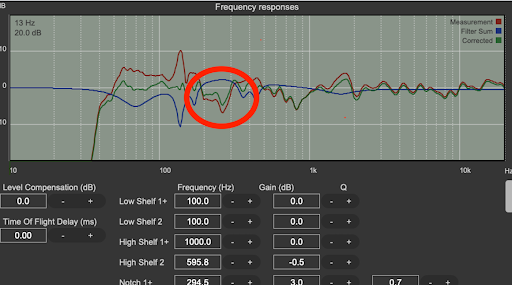 峯:今だと70Hz、80Hz、90Hzにディップがあるのでそうなっちゃいますよね。で、先ほどの通り、スピーカーを壁に近づけていけば低音出てくるのでそれを行うと同時に、この部屋の吸音率がかなり低いので部屋の容積に対してそれを上げていく作業をすれば改善すると思います。