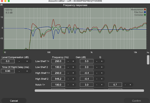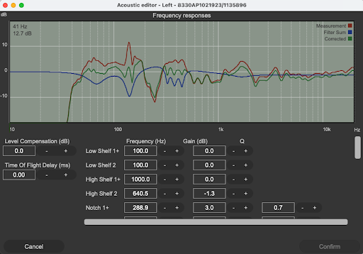 ③最後に②の測定結果を元にスピーカーの設置場所、距離や角度を吟味しながら、吸音材などの位置などを決めていき、その部屋の問題点を可能な限り調整し改善した結果を測定します。