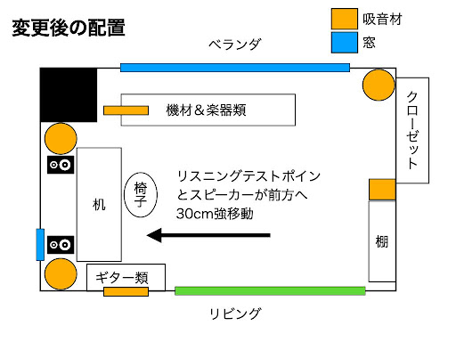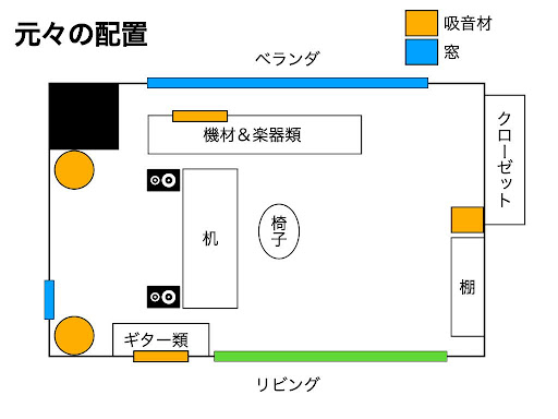 で、吸音する場所もまずは背面、次に一次反射の左右、天井は自分の座る位置より前めな部分に一次反射の場所があるので、順番に吸音していけばいいと思います。