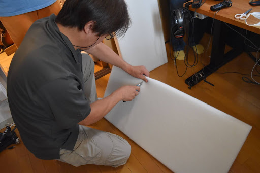 森:今の状態だと前面の吸音が多くてリバーブが聞こえにくいので、少し反射を付けたいですね。スタジオだと木のスリットを前面、横面、天井に付けて調整します。今日はモニターの真ん中に反射を付けて、そこに左右モニターの鏡像を付加して、奥行きを出すことにしてみます。