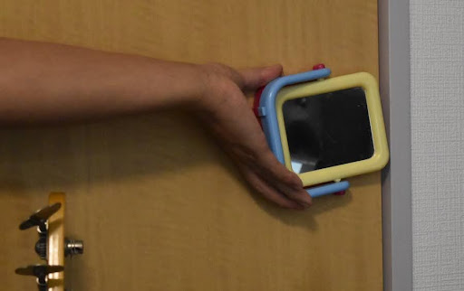 峯:次に左側のギタースタンドの上のところがちょうど第一反射の位置なので、あそこに吸音材を置きたいですね。鏡をあそこにもっていけますか?座ってる位置から見てスピーカーが写る位置がポイントです。