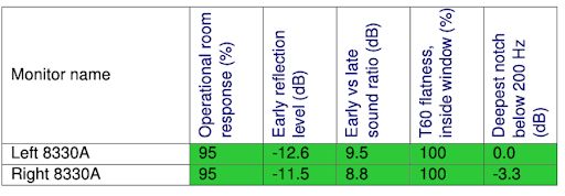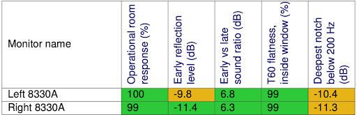 で、この緑はモニターとして「ふさわしい音だよ」オレンジのところは「まあまあふさわしいけど後ちょっと」で、赤くなっちゃってるところは「モニター環境としては要調整」になります。例えば、アーリーリフレクションのレベル初期反射のレベルがちょっと高すぎるとかですね。ちなみに現状はこんな感じでした。