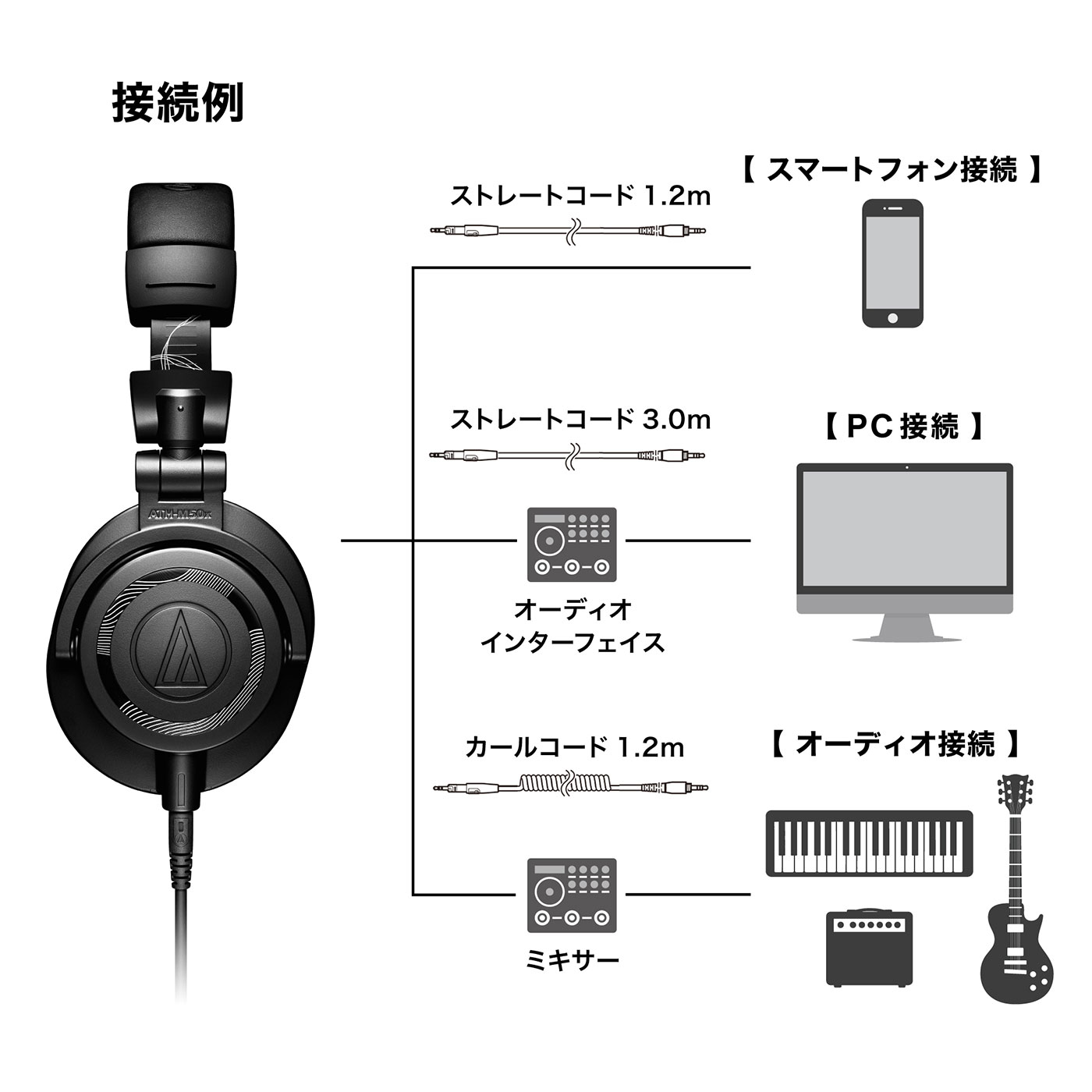 █ 利用シーンに合わせて選べる3 本の着脱コードを付属(1.2m カールコード、3.0m ストレートコード、1.2m ストレートコード)