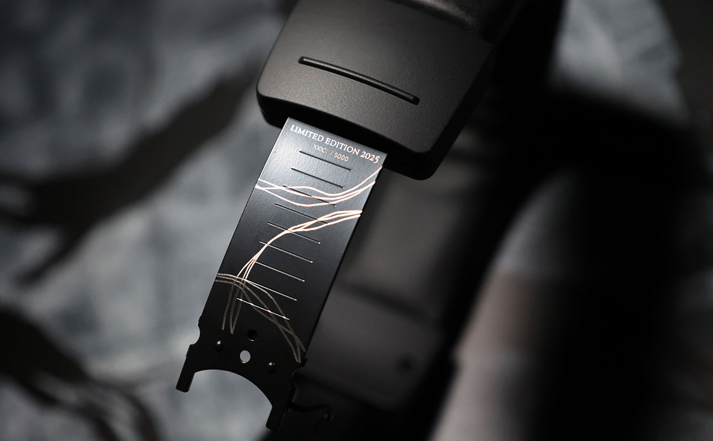 ヘッドバンドのスライダーとリング部分には、墨絵の筆跡と⾳の波形をモチーフにした特別な刻印が。