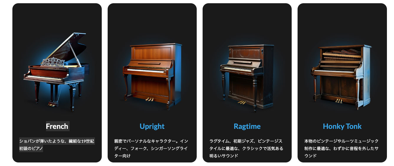 T2L Pianoは、8種類のピアノタイプをご用意しました。映画音楽の制作、ポップスアレンジの作曲、ソロピアノ曲の録音など、あらゆるワークフローに柔軟に対応しながらシステムリソースを消費しません。