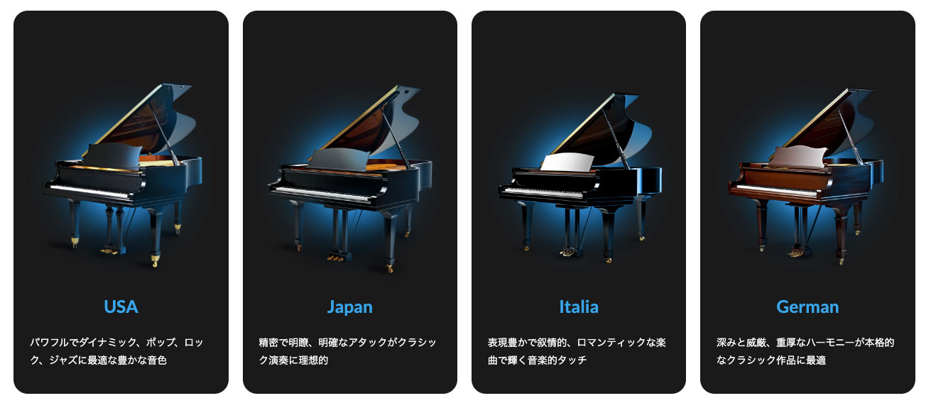 高解像度サンプリングとリアルタイム物理モデリングを融合し、アコースティックピアノの微細な挙動まで再現。ハンマー音、キーオフノイズなどのアコースティックピアノ特有のメカニカルなノイズやペダル共鳴、弦の共鳴もリアルタイムで変化。