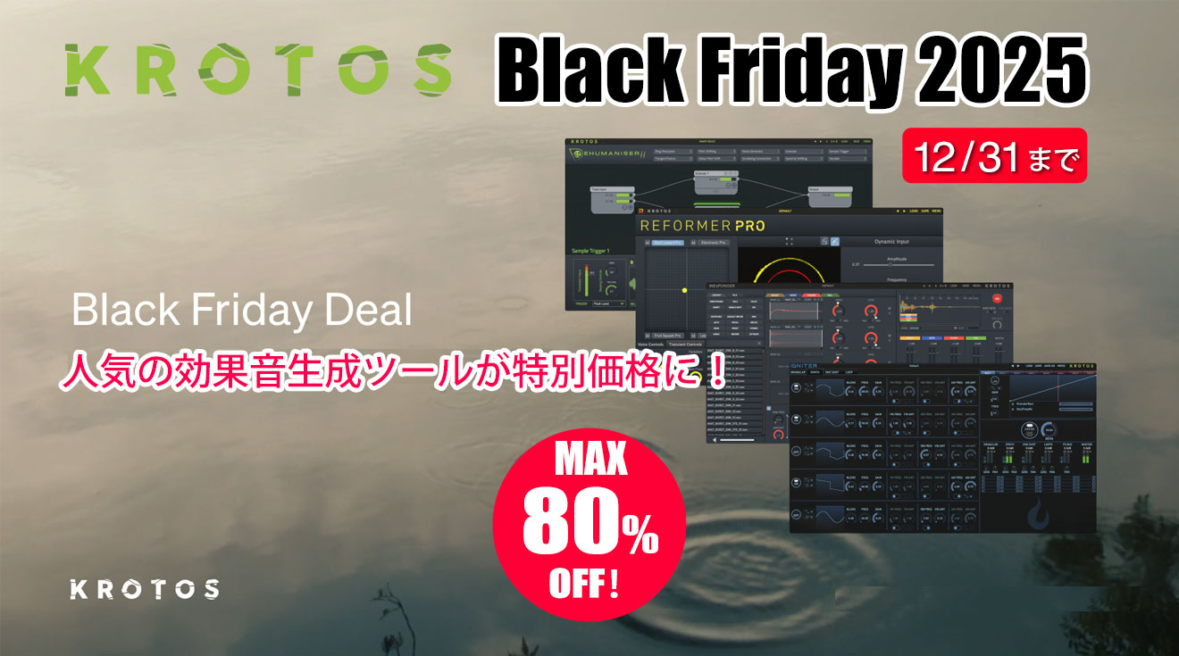 革新的なサウンドデザインアプリケーションをリリースするKROTOS製品が最大80%OFFとなる「Krotos Black Friday 2025」がスタートしました!