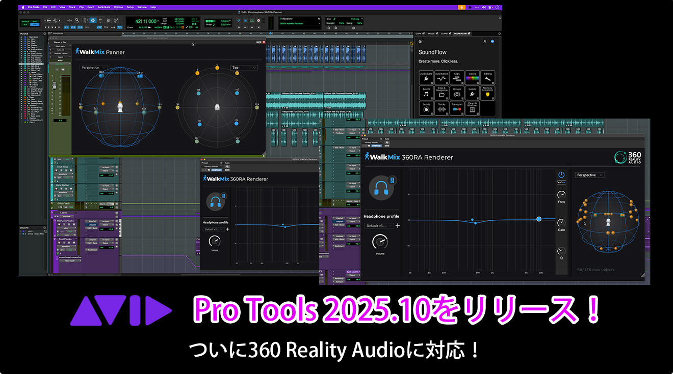 Pro Tools StudioおよびUltimateユーザーは2025.10にアップグレードすることで、Audio Futures WalkMix Creatorの機能限定版であるWalkMix PannerとWalkMix 360RA Rendererプラグインを入手し、Pro Toolsセッション内でSONY 360RAミキシングとモニタリングを行うことができます。