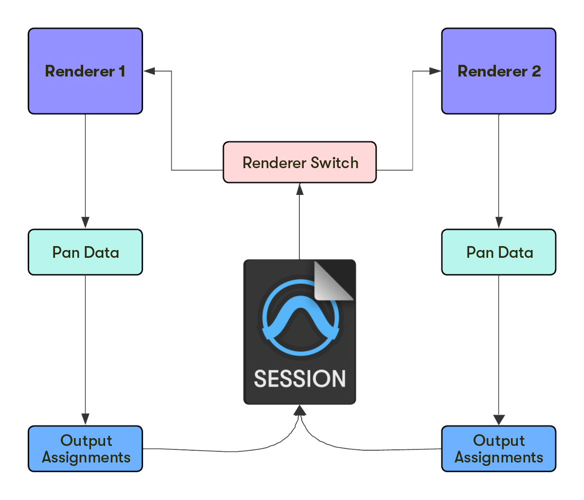 イマーシブ制作において、Pro Toolsセッションを開き直すことなく、異なるレンダラーを切り替えることができるようになりました。レンダラーを切り替えると、もとのレンダラーの設定は保存されたまま新たなルーティングは自動でアサインし直されます。