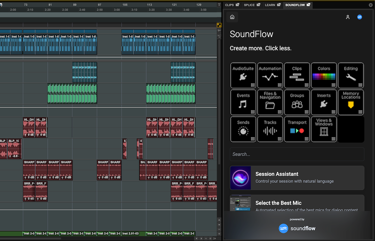 SoundFlow 6 in Pro ToolsはPro ToolsのUIから直接操作可能で、無料で提供される機能はもちろん、すでにSoundFlowのサブスクリプションに加入しているユーザーおよび新たに加入したユーザーは、使用可能なSoundFlowの機能のすべてにPro Toolsセッション内でアクセスすることができます。