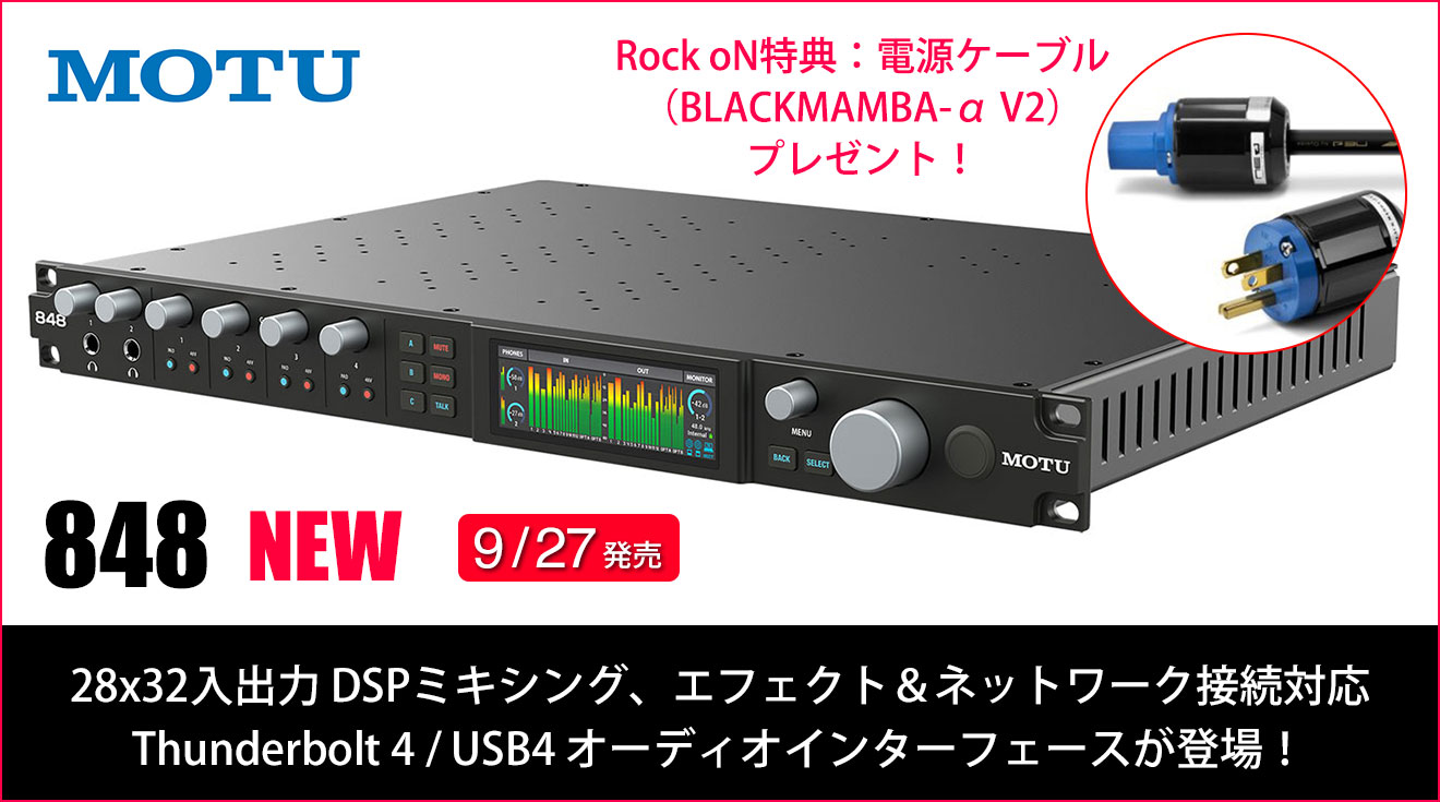 MOTUが、4系統のマイクプリと12系統のアナログ出力を備えた、28×32入出力TB4 USB4 AVB接続対応オーディオインターフェース「848」が、9月27日発売が決定!さらにRock oNオリジナル購入特典として、電源ケーブルBLACKMAMBA-α V2(通常税込価格20,800円相当)プレゼント!