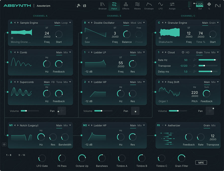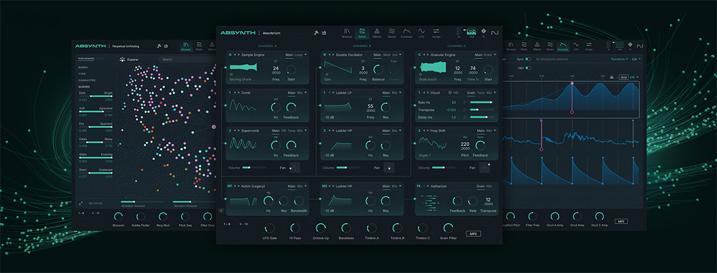 新旧2000種類以上のプリセット(350以上の新規サウンドを収録)と旧Absynthとのプリセット互換性を確保。MPE / ポリフォニック・アフタータッチ、Aetherizer などの代表的エフェクト、そして真のマルチチャンネル・サラウンド空間処理(true multichannel spatialization)に対応。