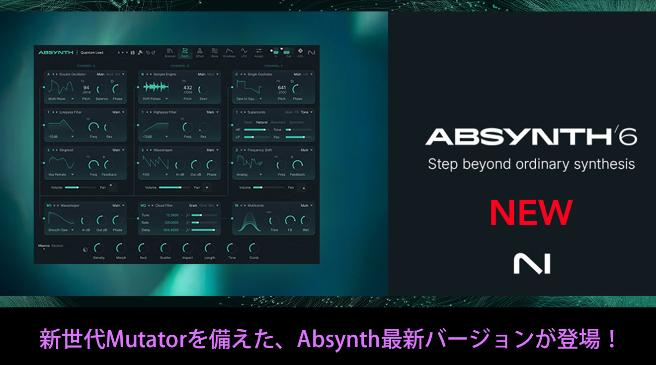 Absynth 6は、Native Instrumentsが誇る伝説的シンセサイザーの “rebirth(再誕)”となる最新バージョンです。独特なサウンドキャラクターとクリエイティブなハイブリッド構造(サブトラクティブ / FM / ウェーブテーブル / グラニュラー) により、幻想的で有機的なテクスチャと、他にはない音響世界を描き出します。