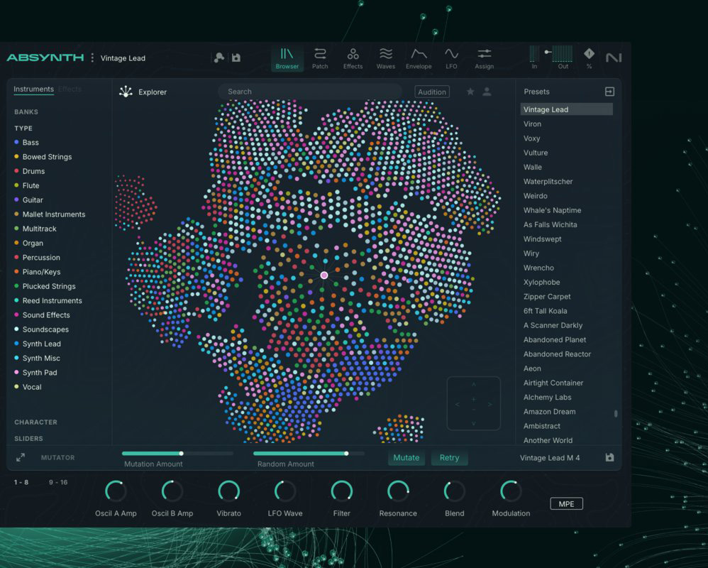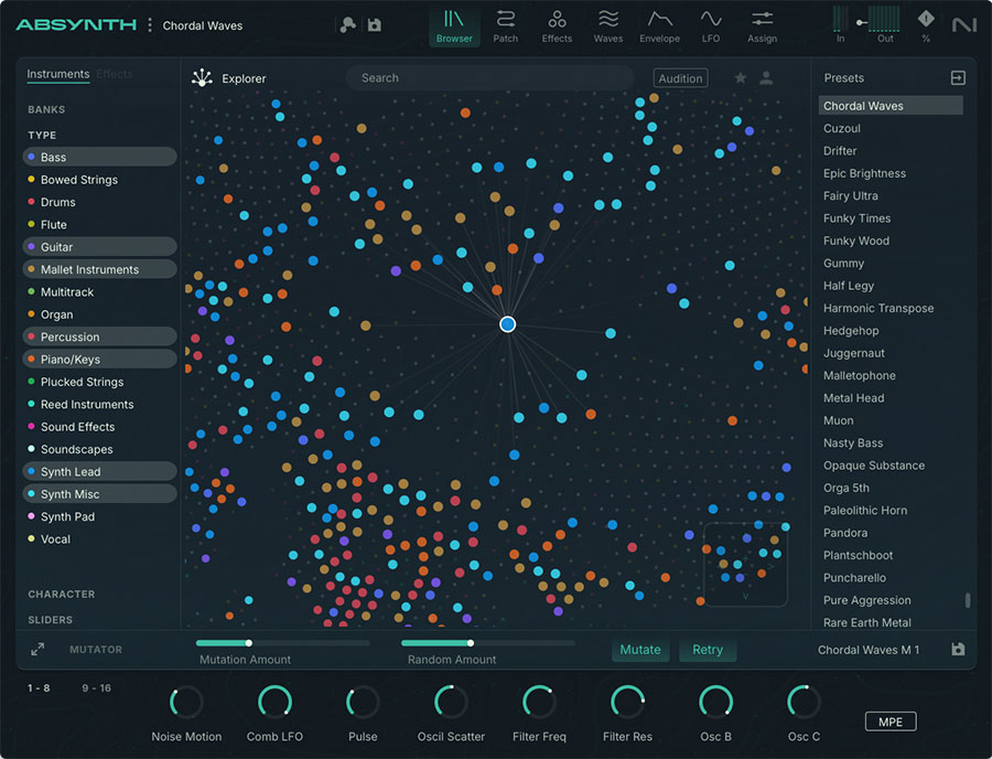 Preset Explorerでは、名前をスクロールするのではなく、感覚でサウンドを探すことができます。音関係の視覚的なフィードバックにより、予期しない発見や効率的な音作りを可能にします。