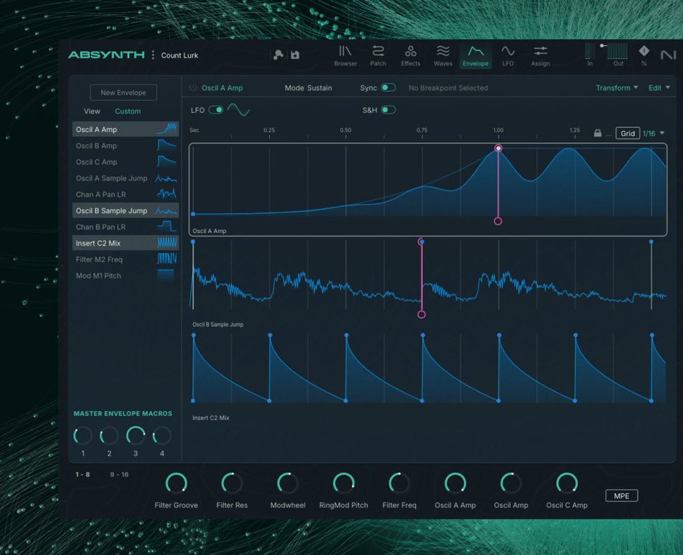 Absynth 6は、ループ、ブレイクポイントカーブ、サステインステージ、タイム同期トランジションに対応した68点のエンベロープ・システムに加え、専用モジュレーションLFOを搭載。これらの柔軟な音作り機能により、標準的なADSRエンベロープを凌駕する、進化し続けるテクスチャーやリズミカルな動きを自由自在に創り出せます。