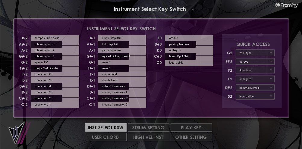 Prominyのギター音源、「SC Electric Guitar 2」等で好評のポリフォニック演奏関連の機能がVM2にも実装され、様々な形態のポリフォニック演奏を再現可能です。ユーザーが自由にボイジングできるユーザー・コードも含めすべてのコードでレガートスライドやグリスダウンが可能です。