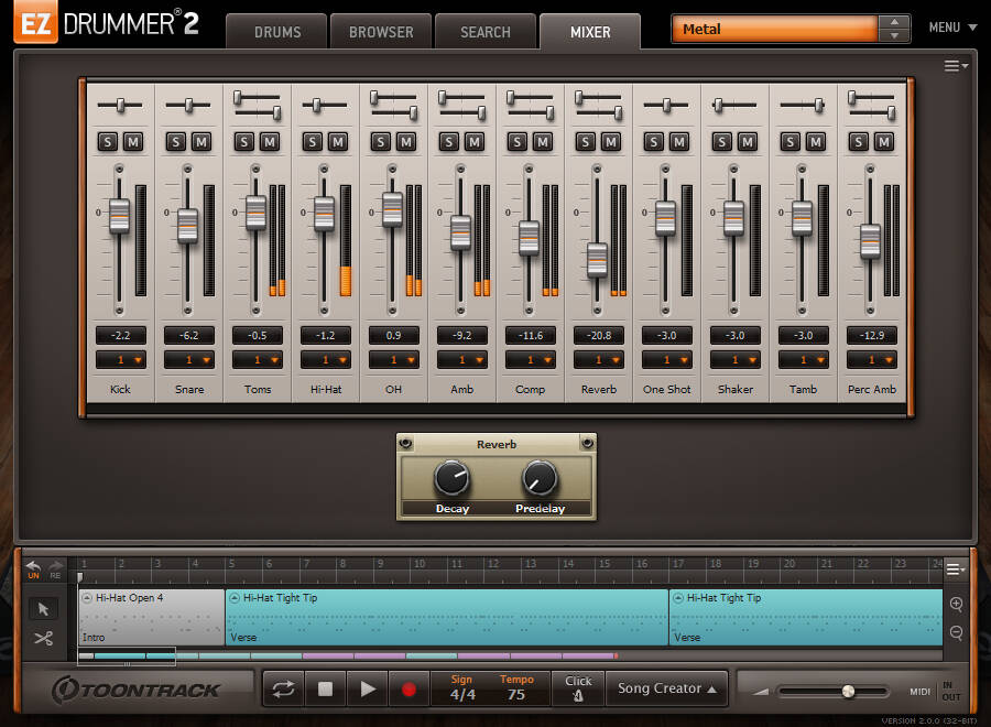 EZdrummer 2はモダンなドラムキットが配置されているDRUMS画面や各ドラムパーツの音量/エフェクトを調節するミキサー画面など、より洗練されたインターフェイスとして生まれ変わっています。ドラム画面ではノートのベロシティに応じてキットの強弱を視覚的に確認でき、ミキサー画面では自分で調整するだけではなくミキサーの豊富なプリセットも用意されています。