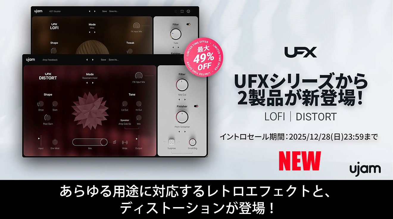 UJAMのUFXシリーズ新製品として、あらゆる用途に対応するレトロエフェクト「UFX LOFI」と、20種類の多彩なディストーション・モードとマルチエフェクトを搭載した「UFX DISTORT」がリリースされます。