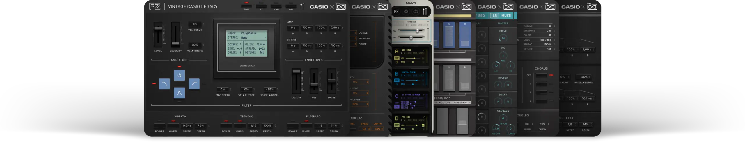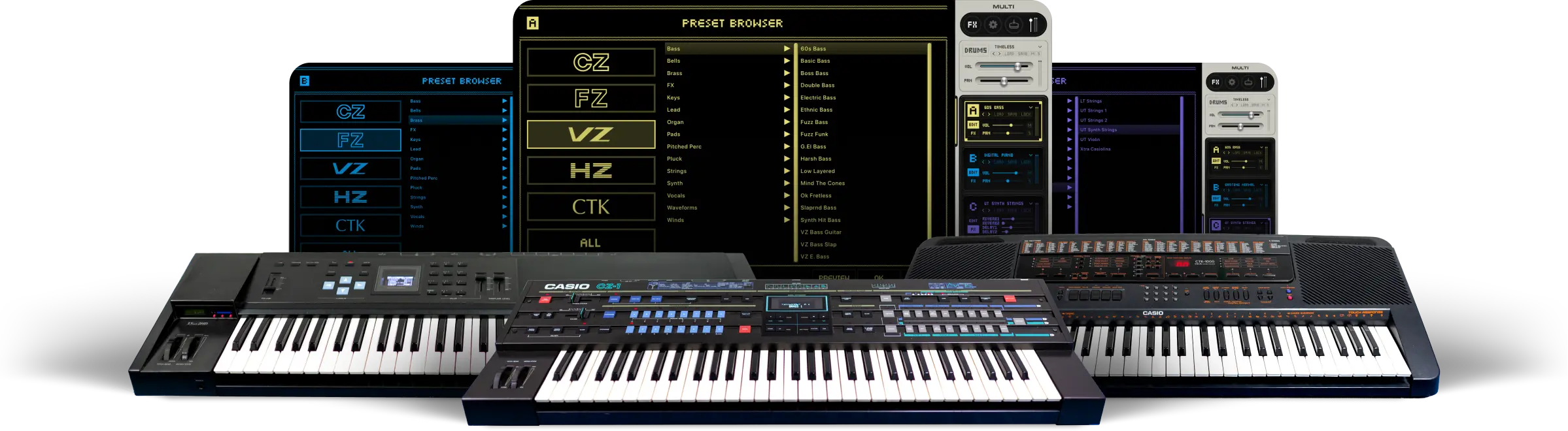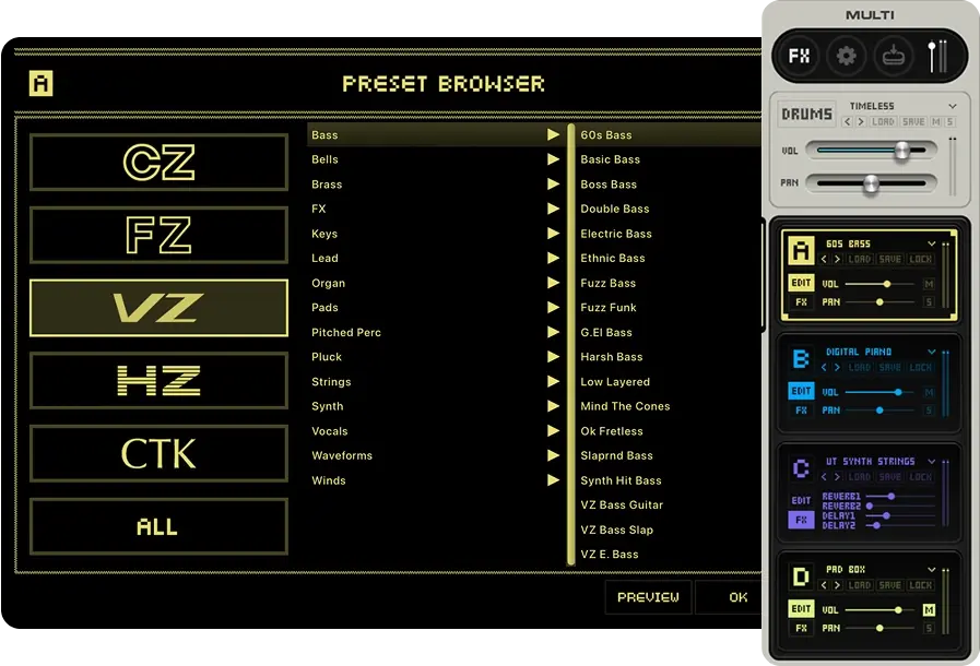Vintage CASIO Legacyは、CZ、FZ、VZ、HZ、CTK、そしてRZという、それぞれが独自の個性と輝かしい歴史を持つ6つの独立した音源で構成されています。特筆すべきは、スイート全体をシームレスに操る専用の「Multi(マルチ)」エンジンです。6つの音源を自在に組み合わせ、高度なパフォーマンスを可能にする統合ワークステーションへと変貌させることで、現代の制作ニーズに完璧に応えます。