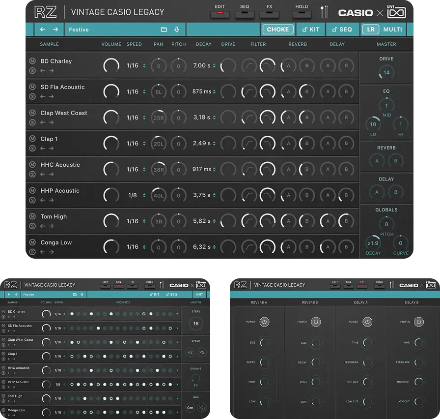 Vintage CASIO Legacyにのみ搭載された「Multi」モジュールは、収録されたすべての音源を一つの強力なパフォーマンス&制作のワークステーション型音源へと進化させます。象徴的なRZドラムエンジンに加え、本コレクション内の全音源から自由にアサインできる4つの独立したシンセスロットを統合。各スロットには専用のアルペジエーターとパフォーマンスコントロールを備え、個々のマシンの枠を超えた圧倒的なレイヤーとグルーブを構築可能です。