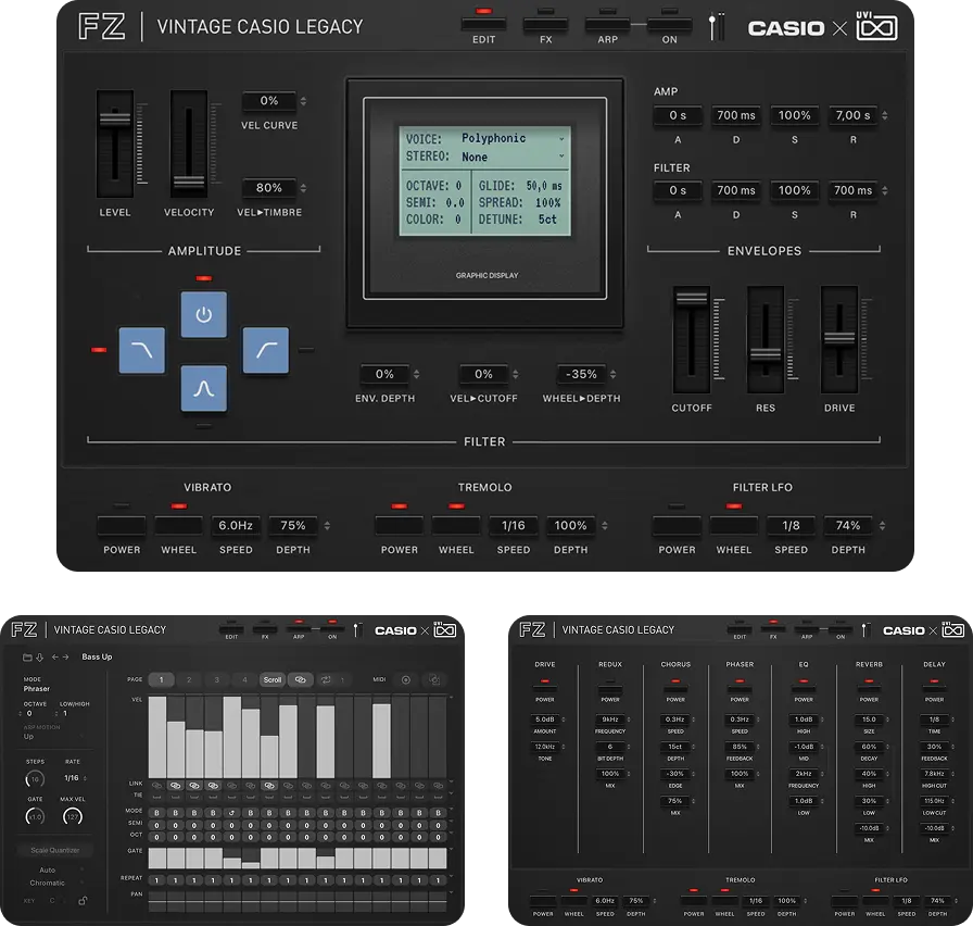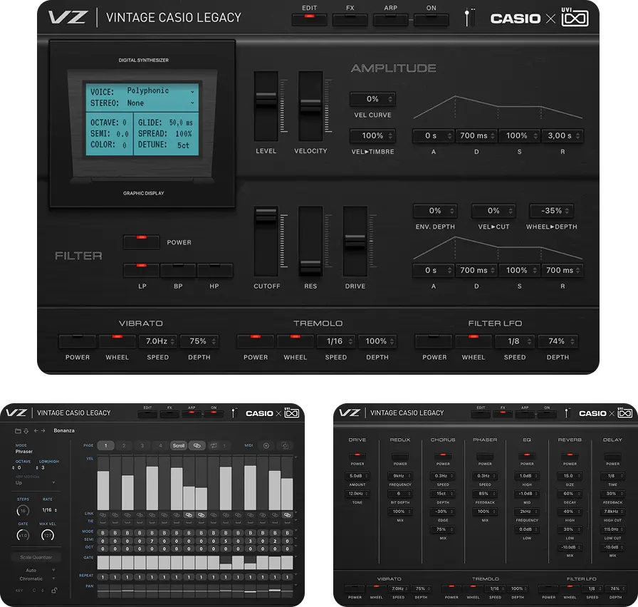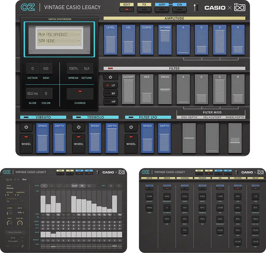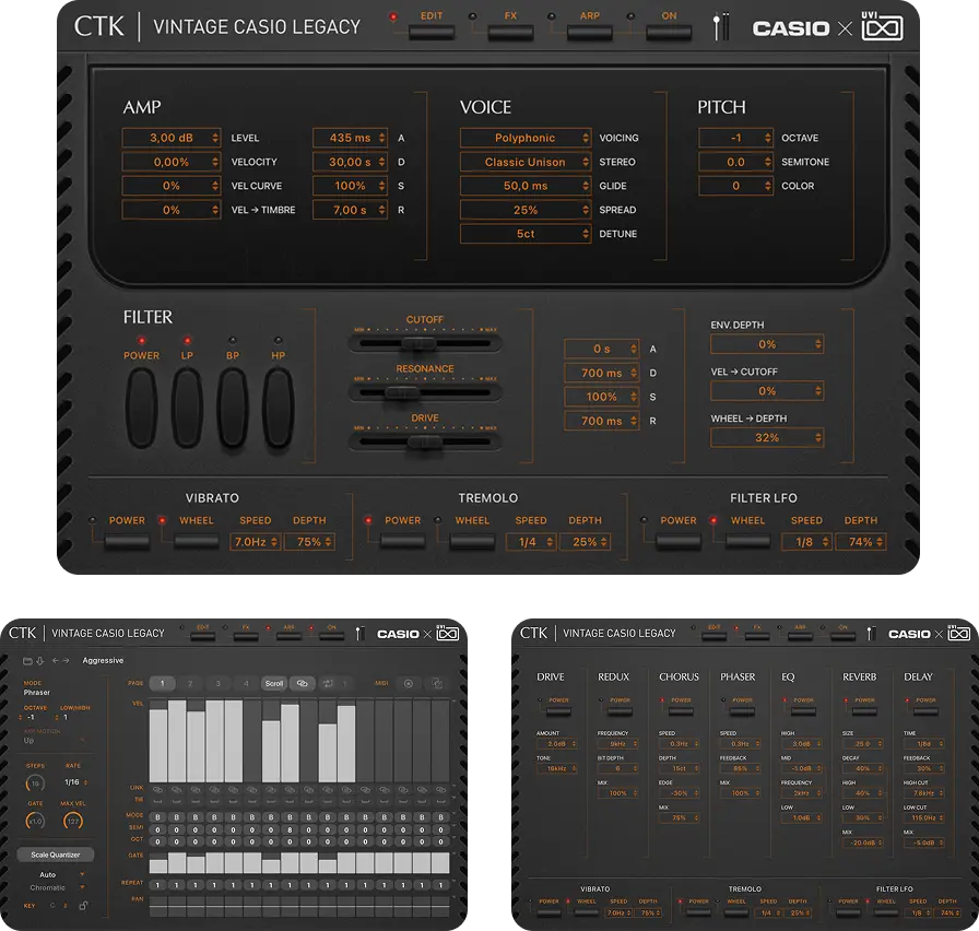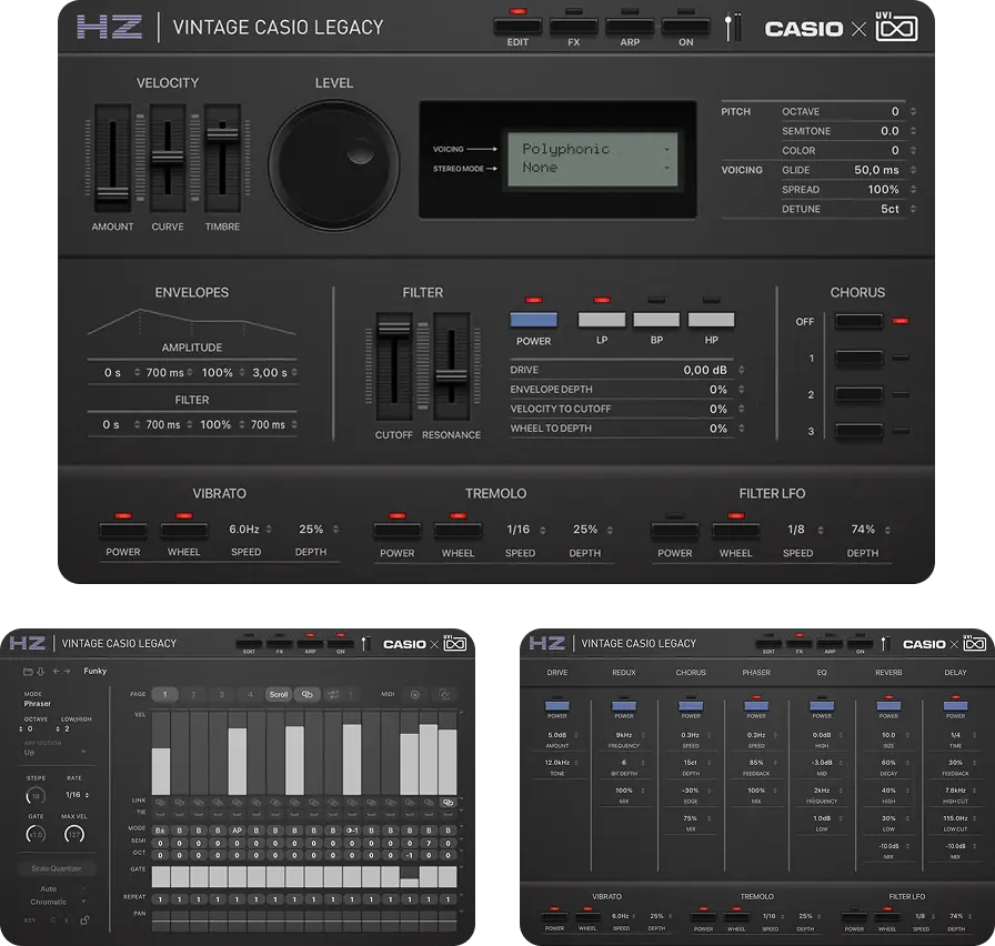 Vintage CASIO Legacyの各音源には、共通の設計思想に基づいた直観的なUIを採用しました。瞬時のサウンドメイクから、細部までこだわり抜く緻密なエディットまで、インスピレーションをダイレクトに音へと反映させる、表現力豊かな操作環境を提供します。