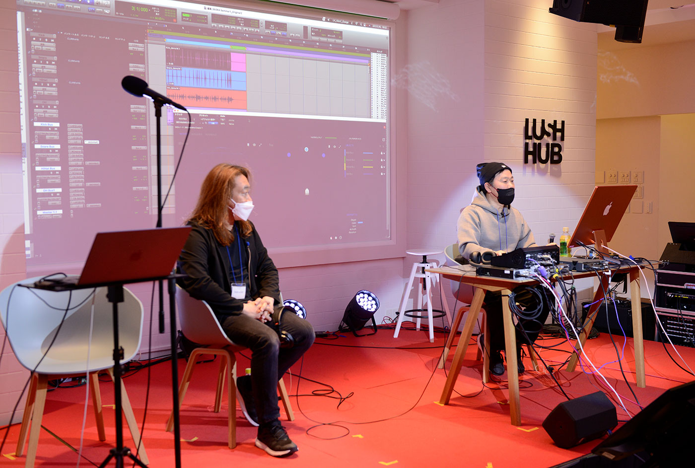 Day1には、Sony Music Publishing,Japan専属作家のURU氏とソニー株式会社の360 Reality Audioコンテンツ制作スペシャリストである渡辺忠敏氏を招いて、360 Reality Audioについての概要と、360 Reality Audio規格作品の制作に必要なエンコーダーを搭載した360 WalkMix Creatorの機能を紹介するセミナーが開催されました。