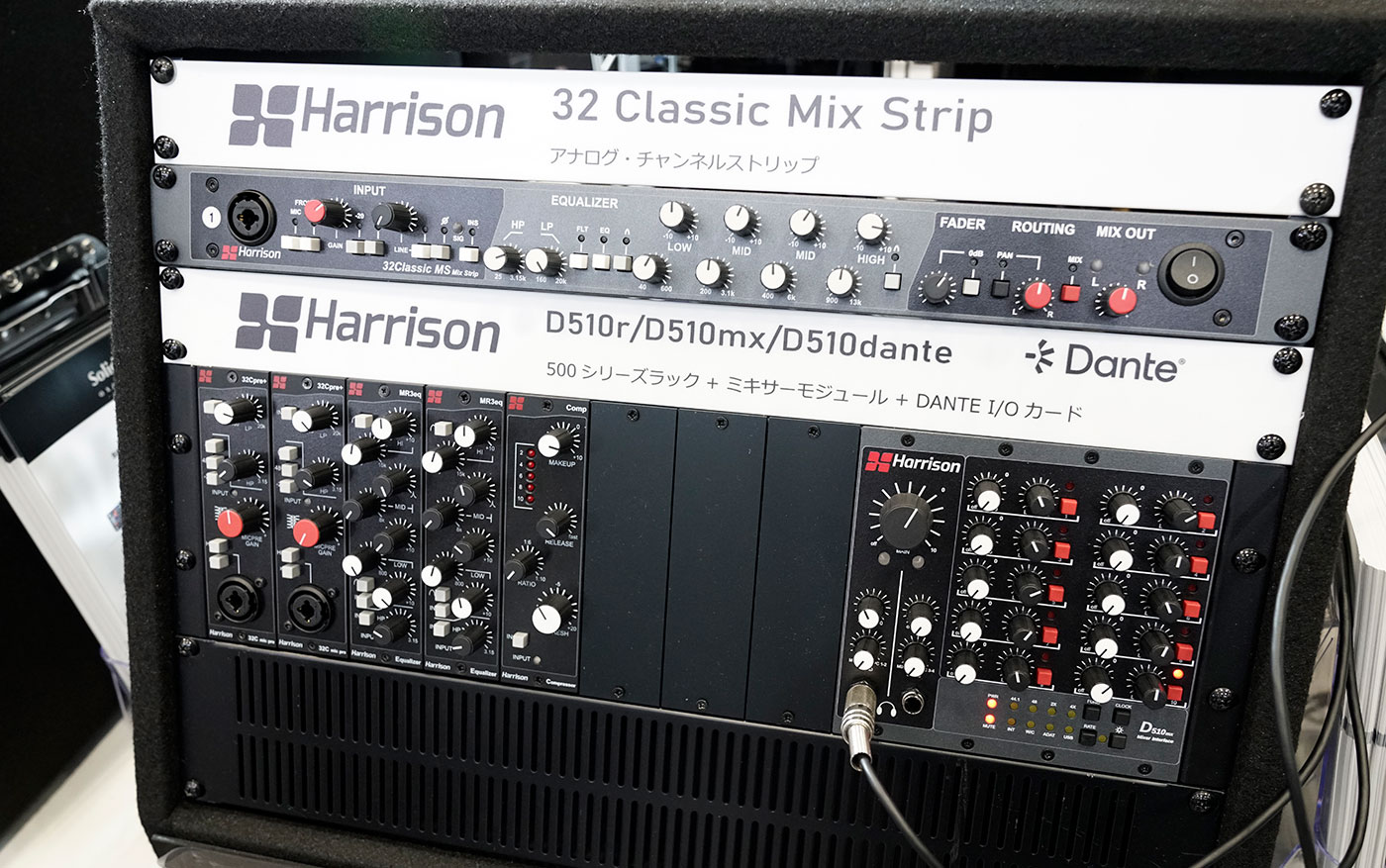 Harrison Audioブランドの製品も、今年発表された10スロット500シリーズラック「D510r」、D510r専用ミキサーモジュール「D510mx」、Dante I/Oカードオプション「D510dante」が展示!Danteのネットワークの中に500シリーズのラックが作ることができるということで、他にはない汎用性と拡張性に優れた500シリーズシステムが構築できる製品です。