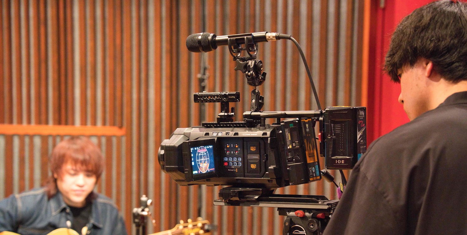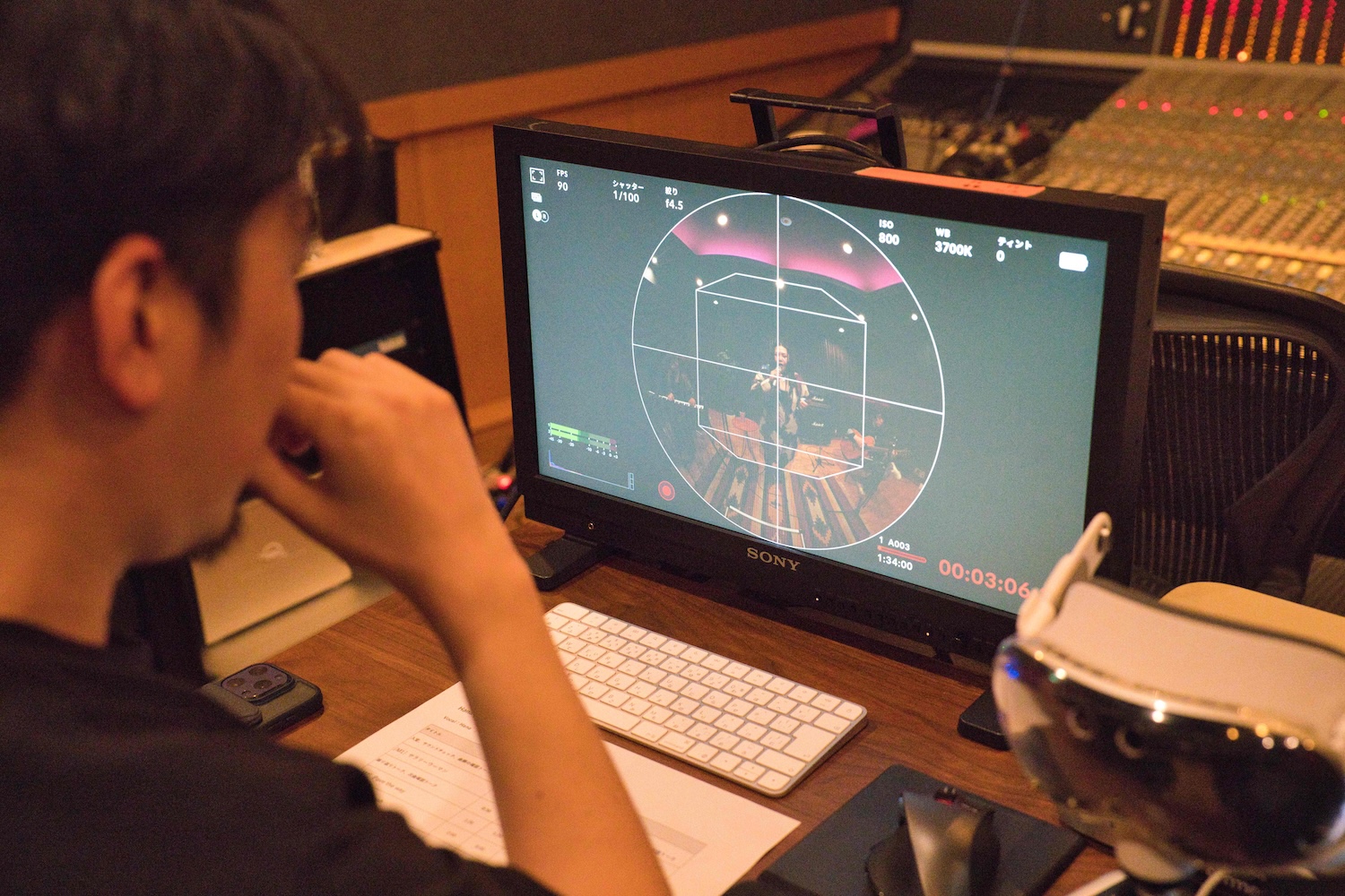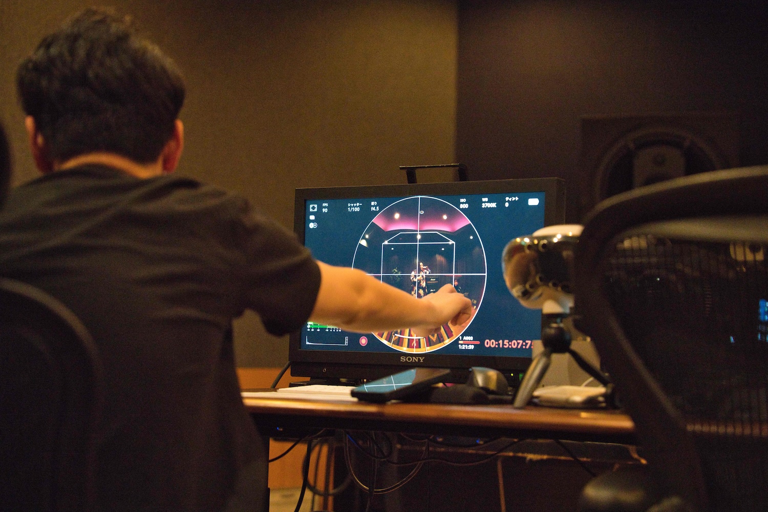 1回目の撮影後、映像をチェックし、カメラのガイドを見ながら画角を調整。キーボードがフレームから外れていたため、ボーカル寄りに配置を修正していました。これは編集時のクロップを想定した調整です。