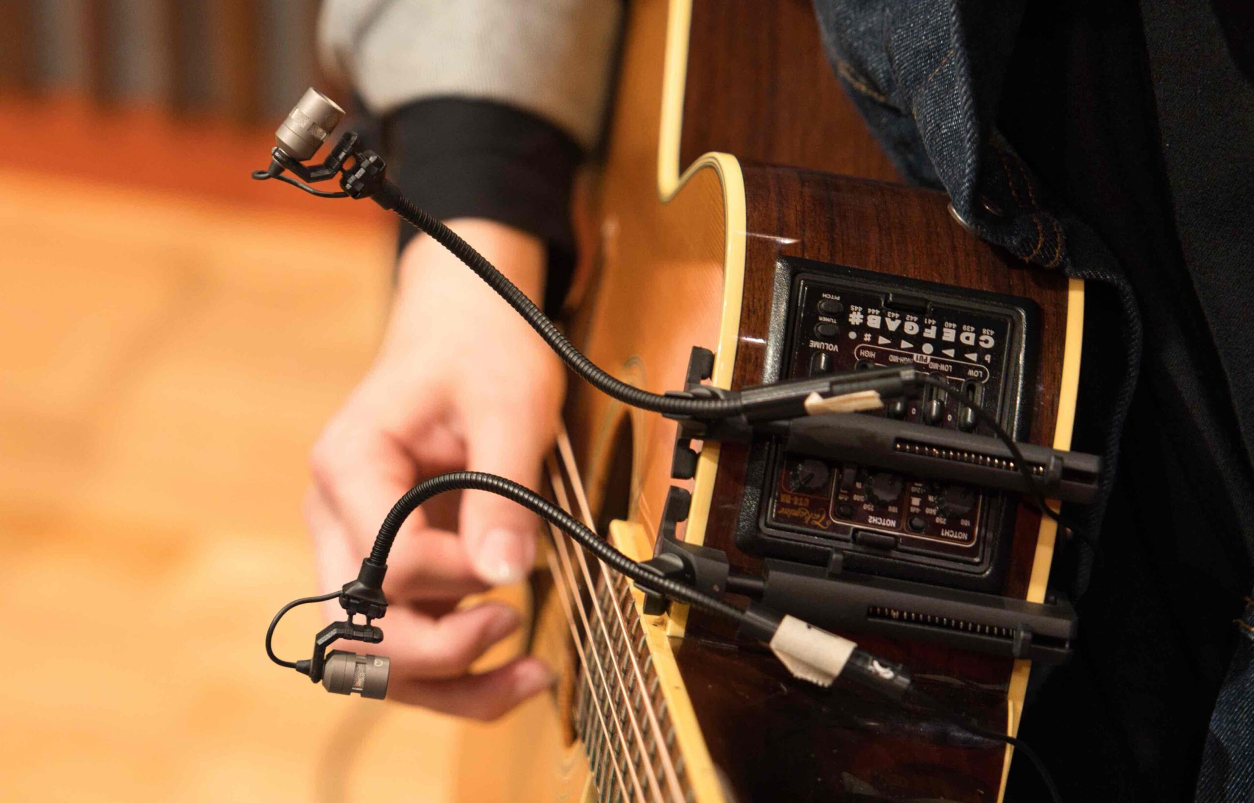 楽器に装着するクリップマイク。近接音をクリアに収録。今回はギター本体の音と、声を録るのみ2本使用されていた。