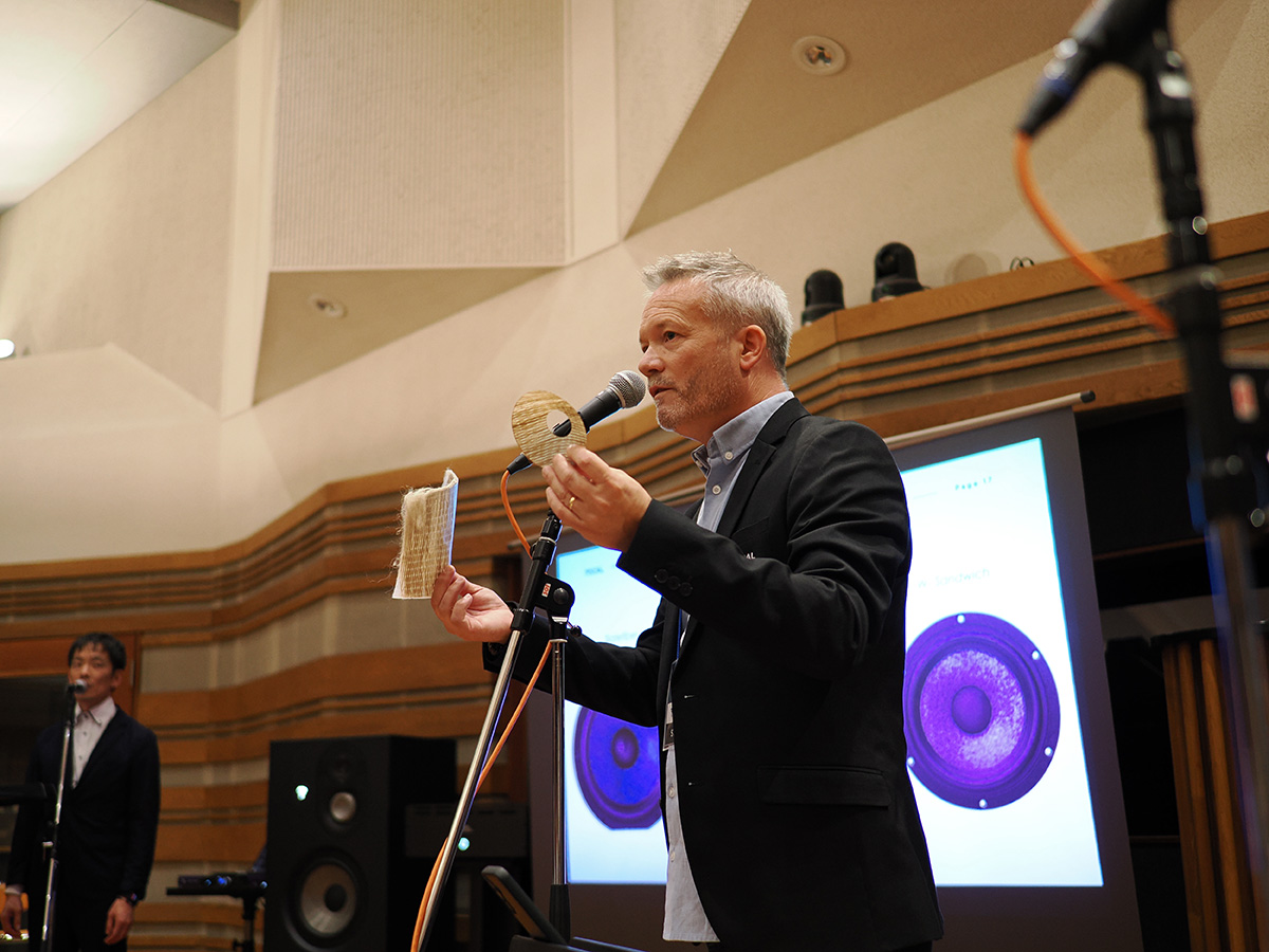 Sylvain Gondinet氏から、最高クオリティのトランスデューサー(ドライバー)を作るための素材特性についての説明がありました 。理想的な素材には以下の3つの特性が不可欠であるとされました。