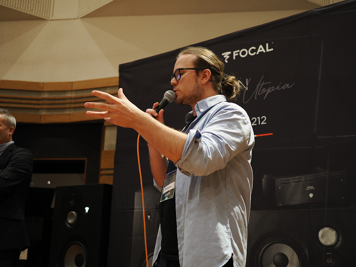 普段、FocalのSub 6とTwin 6を使用しているエンジニアのグレゴリー氏(https://www.gregory-germain.com/)がゲストとして登壇。Utopia Mainの試聴体験について語りました。グレゴリー氏は、Utopia Mainの遠近感の表現がすごいこと、そして難しい音源でも「潰れるような音が潰れずに見える」点に感動を覚えたこと、長時間聴いても疲れないことに加え、どのジャンルでも情報量がしっかりある点を評価。このスピーカーからは、Focalの「本当に完璧なスピーカーを作りたい」という意思が強く感じられるとインプレッションを語りました 。特に印象的だったのは、(正確な音を求める)エンジニアと(楽しい音を求める)ミュージシャン/プロデューサーの両方の要求を満たすような音作りを目指して作られた製品であるという点でした。