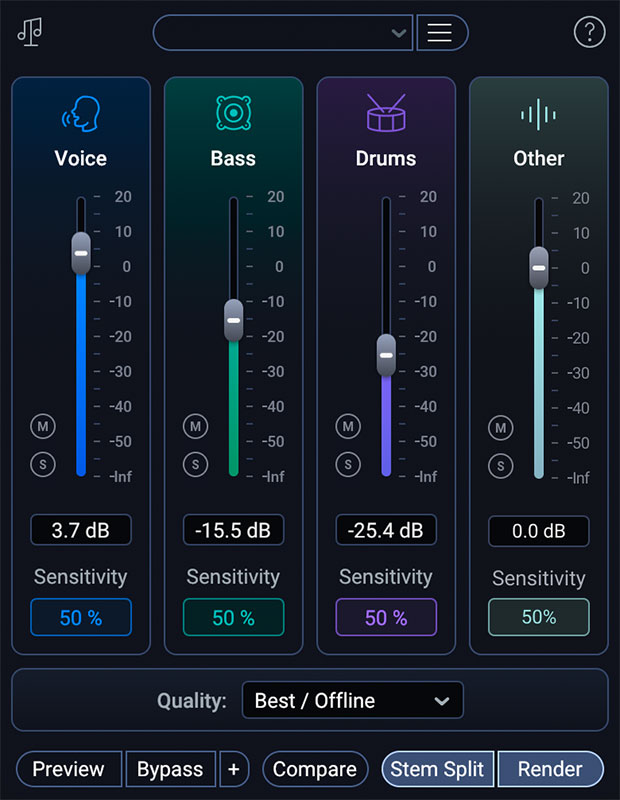 最先端の機械学習により刷新。ドラムの各パート分離に加え、ボーカルや楽器にも対応し、より高精度な信号分離を実現。従来必要だった参照トラックも不要になりました。