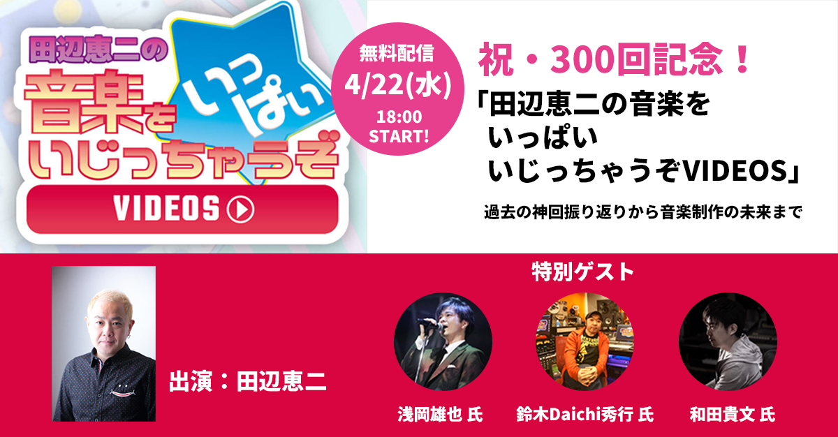 2016年から始まった大人気企画「田辺恵二の音楽をいっぱいいじっちゃうぞVIDEOS」が、2026年4月で記念すべき第300回を迎えました!この記念すべき一つの区切りとして、番組史上初となる『最初で最後の生配信』を開催いたします。