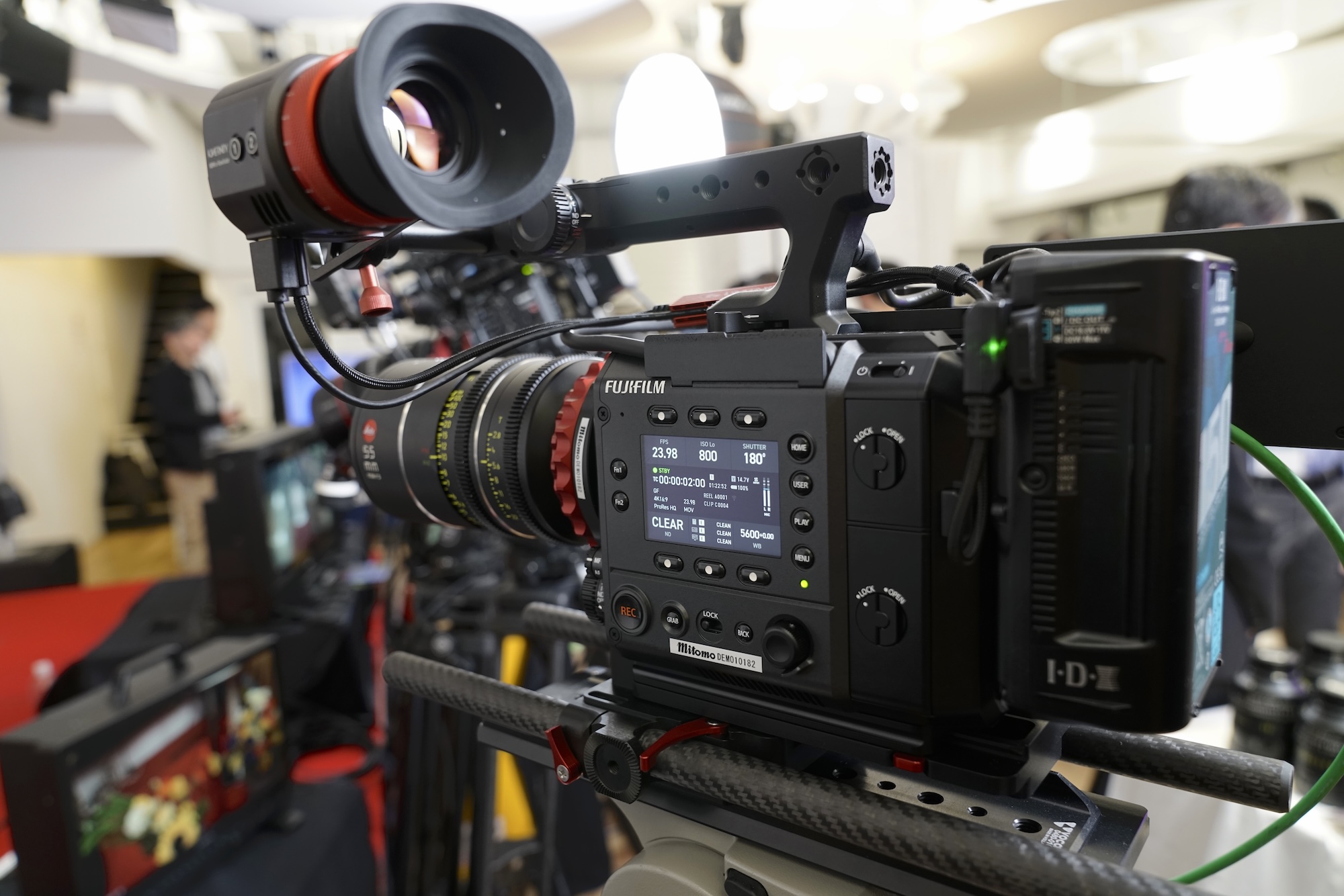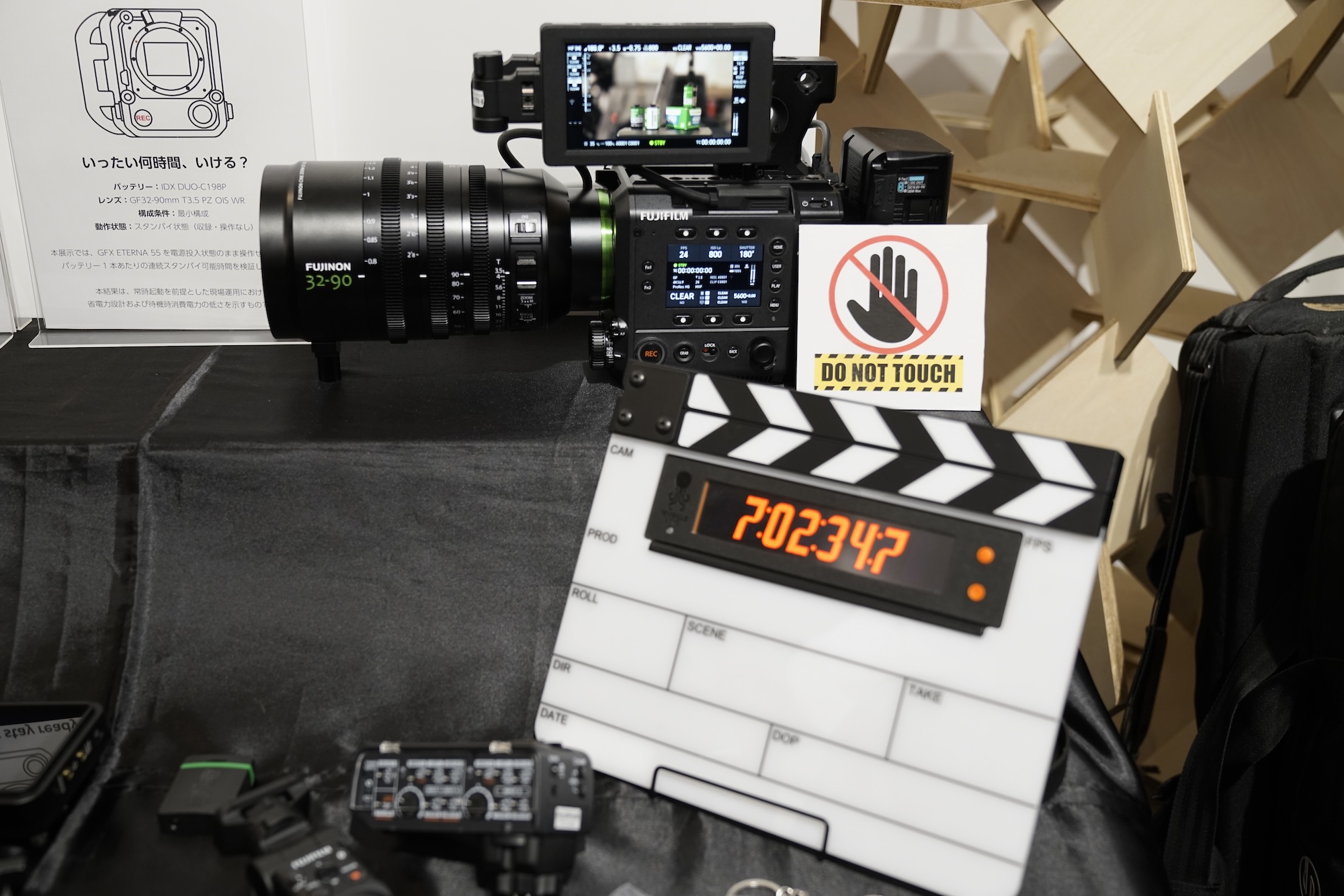 富士フイルムからは、GFX ETERNA 55が展示されていた。ミディアムフォーマットセンサーならではの、階調の豊かさと立体感のある描写が印象的で、シネマ用途を強く意識したカメラだと感じた。特に驚いたのがバッテリーの持ち。展示開始から電源を入れっぱなしの状態で、約7時間経っても残量は30%。このクラスのカメラとしてはかなり優秀だ。予備バッテリーを2本ほど用意しておけば、1日分の撮影は余裕で回せそうな安心感がある。