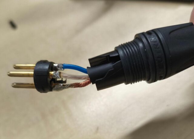 マイクケーブル(XLR-XLR)を例に上げます。オーディオケーブルはコネクタとケーブルで構成されており、それらを接着する時に使うのがはんだごてという事です。