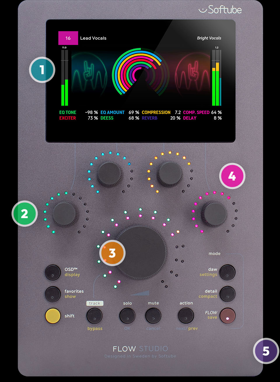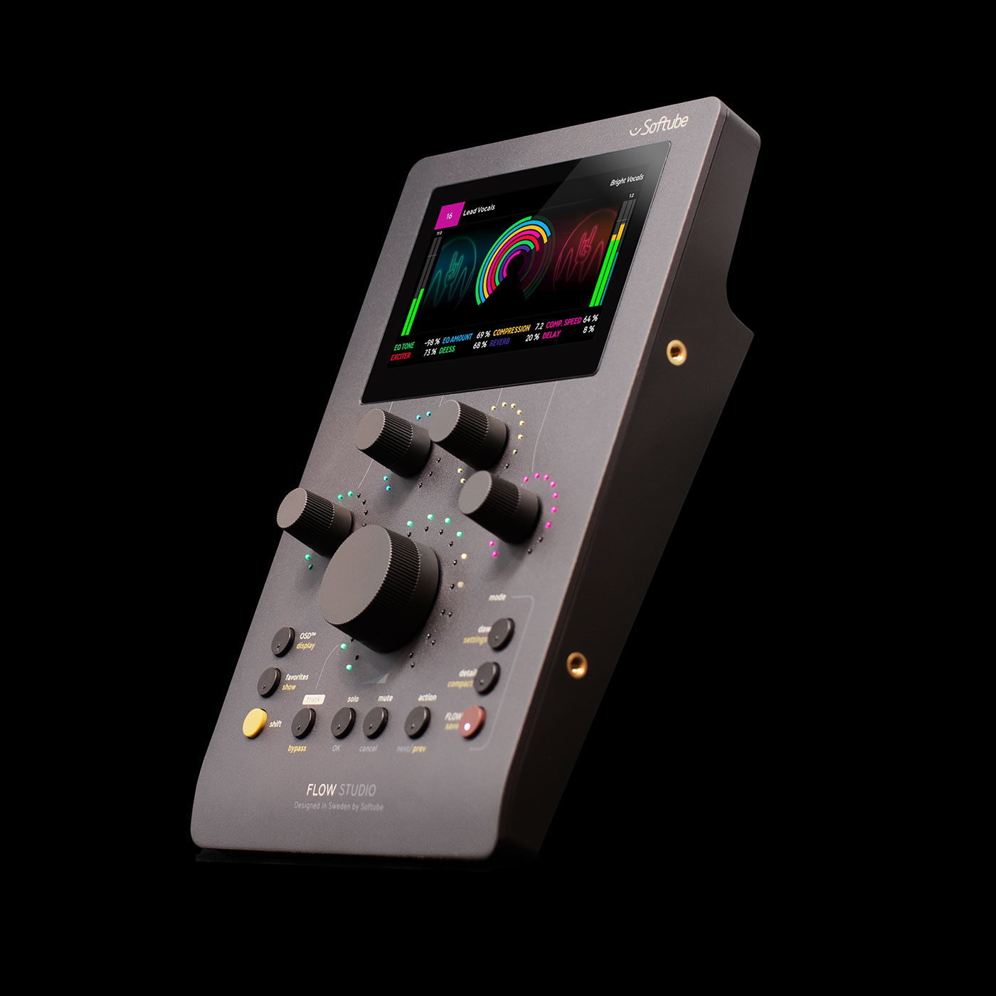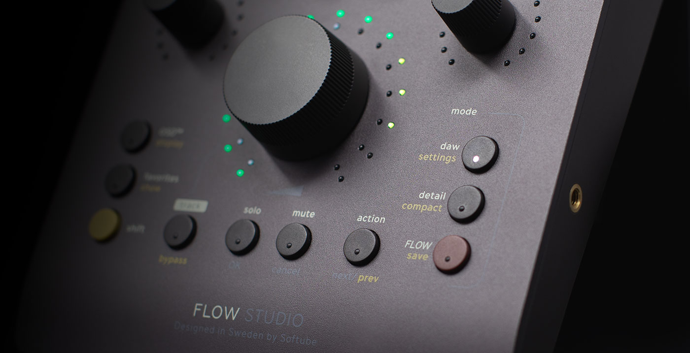 Flow Studioは多忙な音楽プロデューサーのために設計された、まさに“次世代型”コントロール・サーフェス。Softubeの新機軸である「Flow Mixing Suite / Mastering Suite」プラグインを、直感的かつハンズオンで操作するために開発されています。