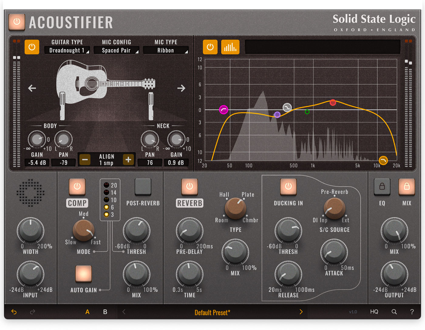 AcoustifierはアコースティックギターのD.I.信号を豊かでスタジオクオリティの音へと変換。デュアルマイク・セットアップのサウンドをエミュレートするAcoustifierは、高度なD.I.-アコースティック・モデリングとSSLグレードのEQ、コンプレッション、リバーブを内蔵し、ドライギターのトーンをさらに強化します。