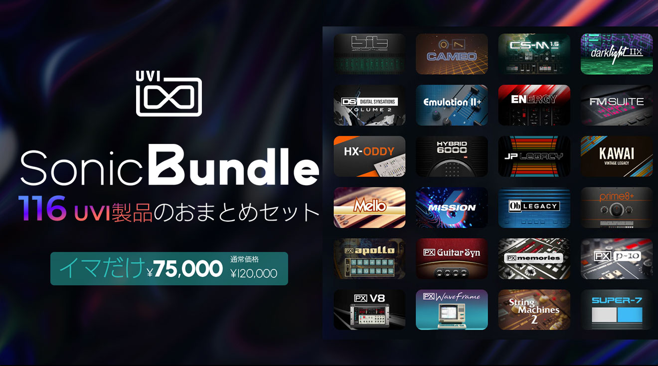 UVIのプレミアム音源やエフェクトを含む116製品の大規模バンドル「SonicBundle」が、期間限定で特別価格になるセールがスタートしました!