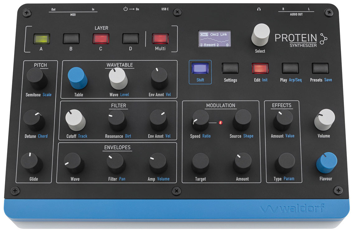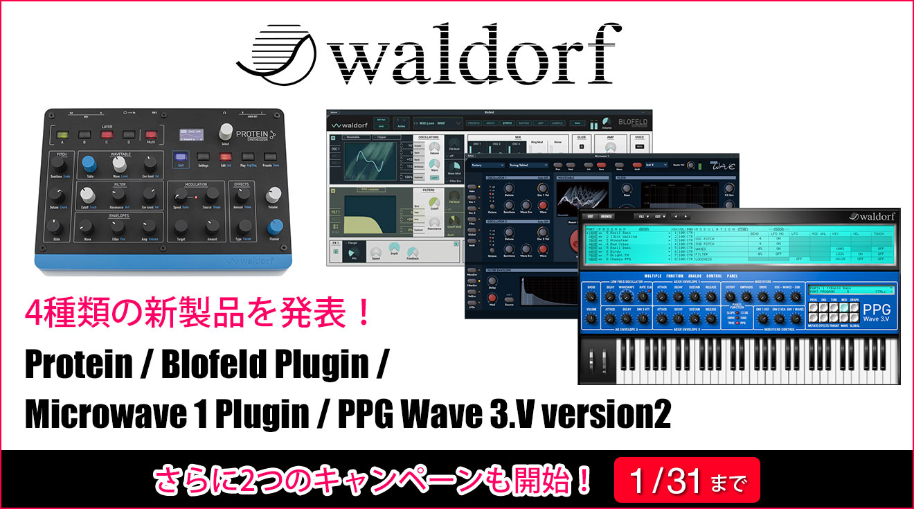 Waldorfが、4つの新製品(Protein / Blofeld Plugin / Microwave 1 Plugin / PPG Wave 3.V version2とUpdate2)を発表!手頃な価格のコンパクトな8ボイス・ポリフォニック・ウェーブテーブル・シンセサイザーProteinのほか、ハードウェアBlofeldのサウンドエンジンをソフトウェア化したBlofeld Plugin、さらには名機を再現したMicrowave 1 PluginやPPG Wave 3.Vといった、いずれもドイツの名門シンセサイザーメーカーWaldorfならではの魅力的な製品が登場です。