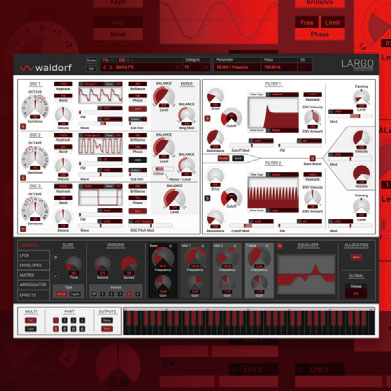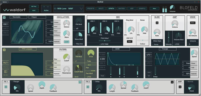 Waldorf伝統のウェーブテーブルを中心に、バーチャルアナログ波形、ノイズ、モジュレーションなど、Blofeld の幅広いサウンドメイクをそのまま利用できます。特に、ウェーブテーブル特有の滑らかなモーフィングやデジタル特有のエッジ感、ハードウェア版で人気の高いフィルターの特性とサウンドも忠実に再現。