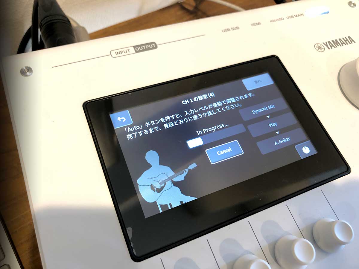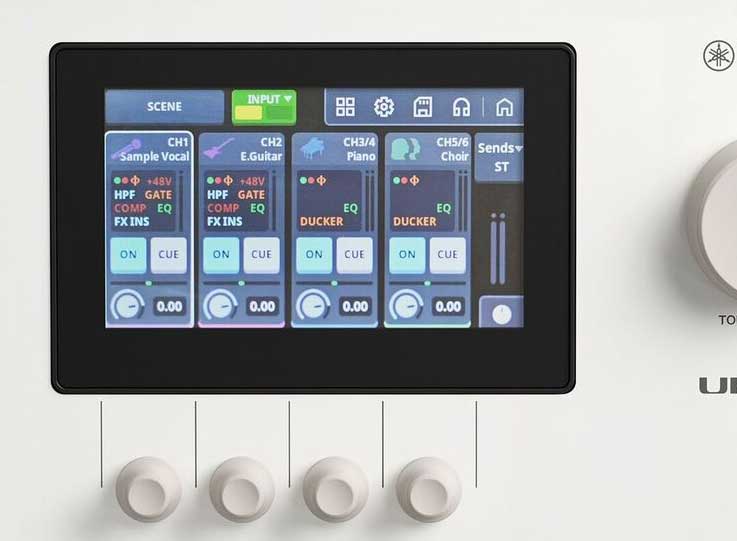 本体を手に取ると、約2.0kgという若干の重量感と、ひんやりとした堅牢な金属筐体が、プロユース機材としての安心感を感じました。デスクに置いた際の安定感も抜群で、トップパネルに配置された4.3インチのカラータッチスクリーンと整然と並んだノブからは、「複雑な操作を直感的に行える」というヤマハの洗練された設計思想が伝わってきます。